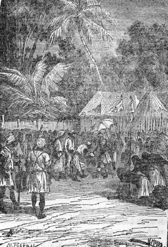 原来,卡佐德的君王莫尼·龙加亲自来市场参观。他的身后跟着无数的随从,其中有他的妻子们、他的官员、士兵以及奴隶。奥维斯和其他的奴隶贩子急忙迎上前,很自然地做出一些夸张的恭敬行为,以博取这位残忍的君王的欢心。