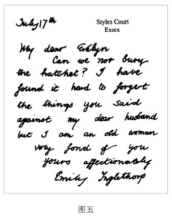 霍华德小姐拿出了英格尔索普太太在十七日傍晚写给她的信。波洛和我当然已看过了。它对我们了解这一惨案没什么帮助。下面是副本(图五):