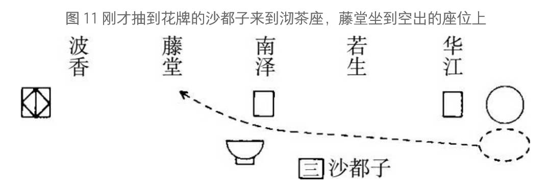 沙都子拿起替换牌,右脚先起站了起来,走向沏茶座,准备沏第二碗茶。藤堂则从借位中起身,坐到了她的位子上。(图11)
