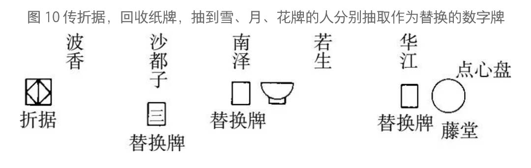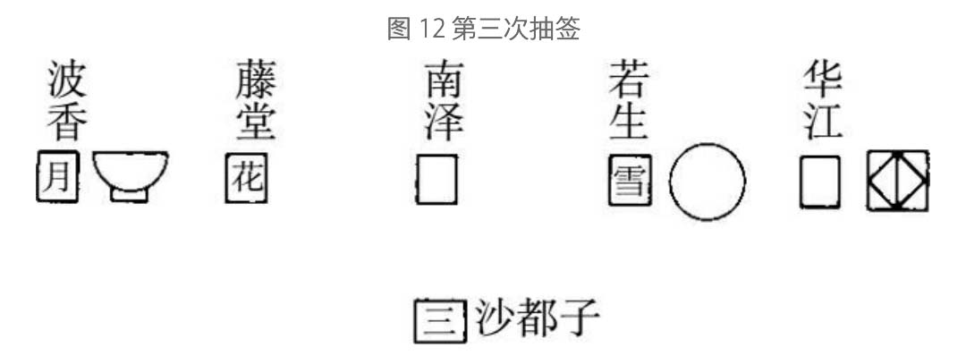 波香按惯例取了茶碗回到位子上。与此同时,点心盘也从前一轮抽到“雪”的华江那儿传到了若生手里。(图12)