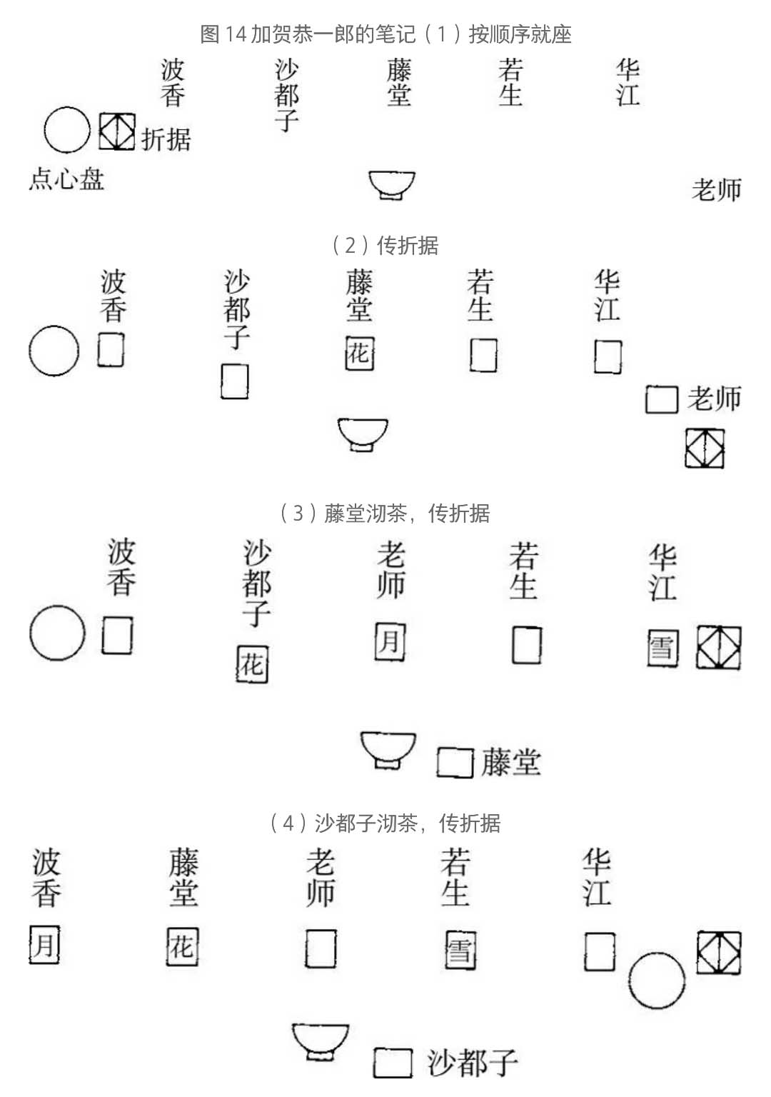 3. 藤堂沏茶。座位顺序变成:波香、沙都子、老师、若生、华江。再传折据,沙都子是“花”,老师是“月”,华江是“雪”。