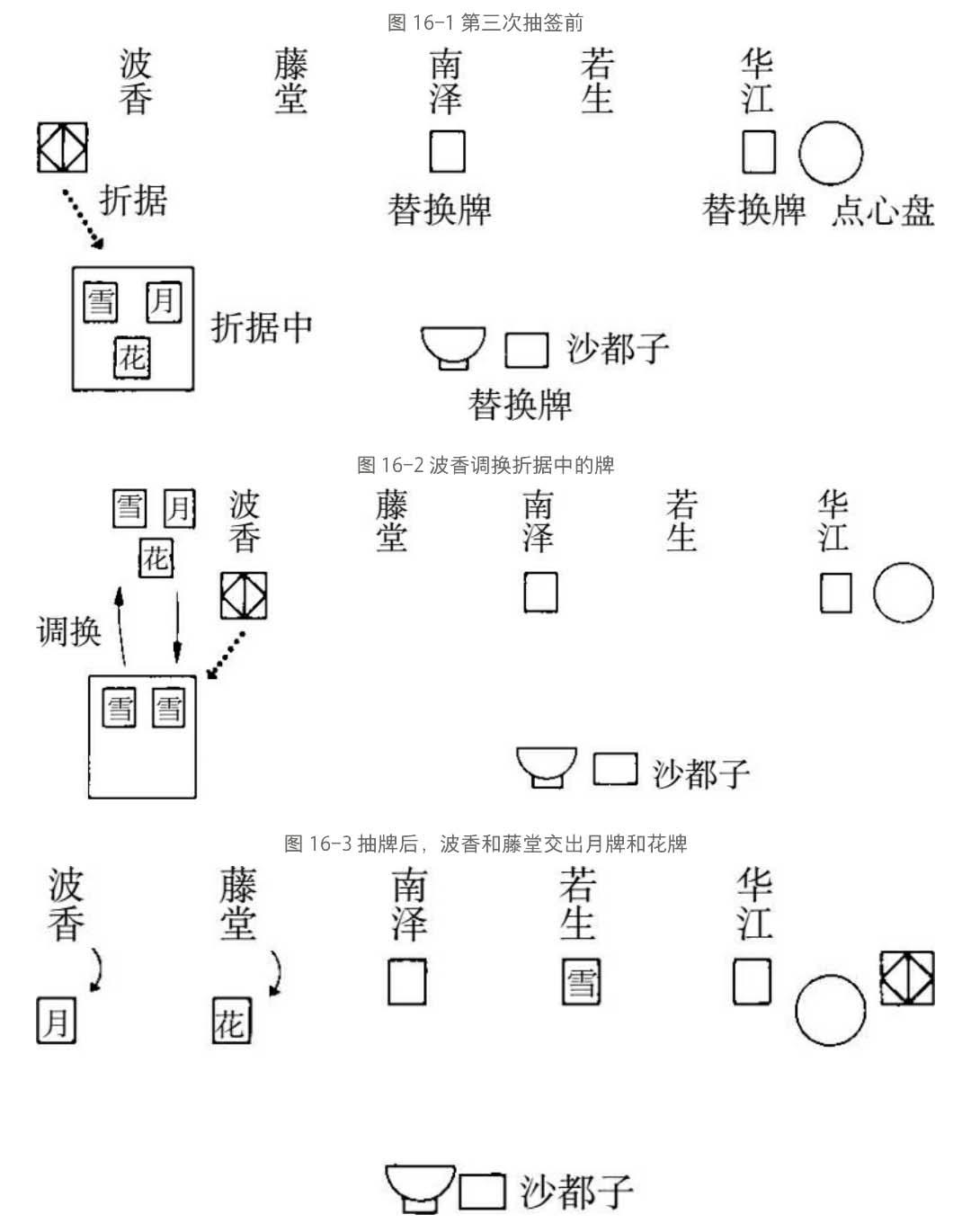 “藤堂接过你传来的折据,做了跟波香一样的动作。他也装作抽牌,实际上却从口袋里拿出了牌。折据接着照常传下去,藤堂就成了‘初花’。”
