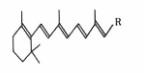 从锥状体与杆状体中可以分别抽取出所谓的视紫质与视红质,但是,这种物质如果照射到光线就会褪色,也就是说,这就是转换为视觉细胞亢奋的引信——视物质。试着调查这种视物质的构造,可以知道可区分为视网膜与视蛋白(神经膜),亦即,视紫质是视网膜与锥状体视蛋白,视红质则是视网膜与杆状体视蛋白各自的结合物。所谓的视网膜,乃是一种与维他命A酷似的物质,其结构式如下: