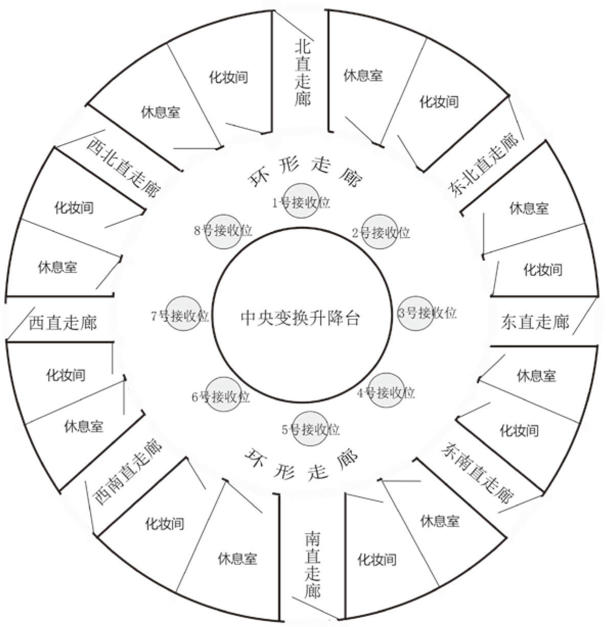 接收位一共有八个,沿着环形走廊均匀分布,各自贴着编号,与上层的掉落位对应。接收位的对面是化妆间和休息间,房间的旁边则各有一条直走廊,通往建筑体外部的门。被接收的选手,通常会被工作人员送至相应的休息间休息,或在化妆间卸妆,然后通过那个方向的走廊离开。