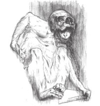 那东西真像个鬼:半大孩子身形,浑身生着灰毛,有尾巴,脑袋却是个骷髅,白森森地反着光,生着一块块黑斑。它身上挎着个蓝灰色小布袋,站在阁楼梯子上看着我们,吱吱地叫了几声,蹿进阁楼,从天窗一跃而出。