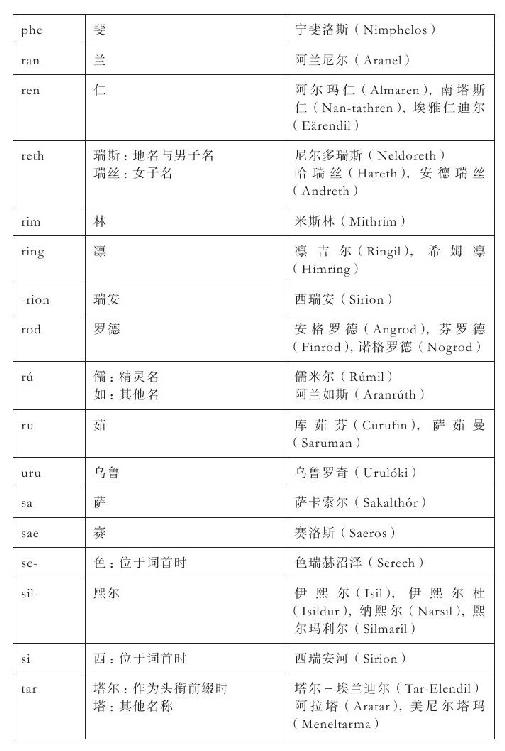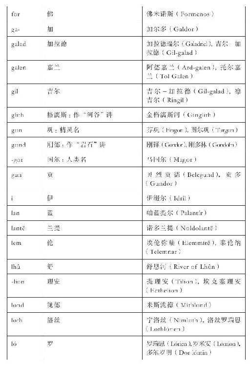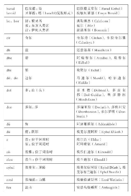 这个精简过程主要涉及这样的事实—精灵语名称的英语译名也经常作为名称独立使用。例如,辛葛王居住的地方既称为“明霓国斯”,又称为“千石窟宫殿”,有时二者还同时出现。我对这类情况的基本处理方法是,将精灵语名称和它译成的含义列进同一条目,如此一来,条目下的页数参考不限于当前条目本身(例如,“埃霍瑞亚斯”下的页数参考也包括那些列在“环抱山脉”下的)。英语译名只有在独立出现时才给出单独的条目,但只简单地指向主条目。说明中用引号括起来的部分是该名称的翻译,其中很多都在故事正文中出现过(例如:“孤岛”埃瑞西亚),但我又另外补充了很多。还有一些未曾翻译的名称,相关信息收录在《附录》当中。