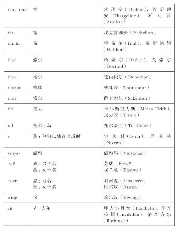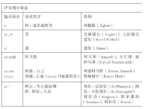 汉语普通话发音与精灵语、矮人语有极大不同,中文译名不可能精确体现原文,只能尽量贴近,且不可避免会有种种妥协,还请读者理解。此外,精灵语名称的翻译方法与现代英语名称的标准翻译方法必须有所区别。现代英语名称通常不必考虑词根含义,依照发音定字即可,但精灵语名称通常由有意义的词根组成,必须予以体现,不能单纯依照发音来定字。例如,-rond与-lond对应的中文读音相近,但词根的含义大相径庭:-rond意为“穹顶”,故作“隆德”,而-lond意为“港口”,故作“泷德”。