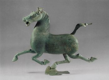 这是一匹骏马奔驰的雕像。马为中国早期雕塑中的重要题材,秦始皇兵马俑就有千余座马的雕塑。这座雕像的特殊之处,正在于它的重点并不是表现马,马只是它借用的一个道具,它要表现的是飞动之势。