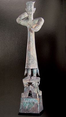 这里出土的高2.62米、重180多公斤的巨型青铜立人像,是中国早期青铜器中罕见的全身青铜人像。人像头上有冠,面部夸张,眼睛突出,耳朵悬垂,穿着左衽长袍,衣服有三层,手臂平抬,脚下佩戴脚镯,显得威武高大,又很神秘。人像比真人高大,夸张的意味浓厚,显然是宗教祭祀的神像,也当是蜀国的开国君主蚕丛。