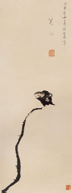《孤鸟图轴》是八大山人一幅感人的作品,画面左侧伸出一根枯枝,枯枝略虬曲,在枯枝的尽头,画一袖珍小鸟,一只细细的小爪,立于枯枝的最末梢之处。似展还收的翼,玲珑沉着的眼,格外引人注目。孤枝,孤鸟,独目,独脚等,这是多么孤独的世界,八大山人用它来表现人独立的精神。《莲房小鸟》是他67岁时的作品。这幅画画一枝欲放未放的莲花,无根的莲枝,从左侧斜斜地伸出,荷塘、荷叶都被删去,一只从远方飞来的小鸟,似落而未落,欲立而未稳,闪烁着欲动又止的翅,睁着迷离恍惚的眼,一只小脚似立非立于莲蕊之上。一切都飘渺无定,画家借此表达一尘不染的思想。
