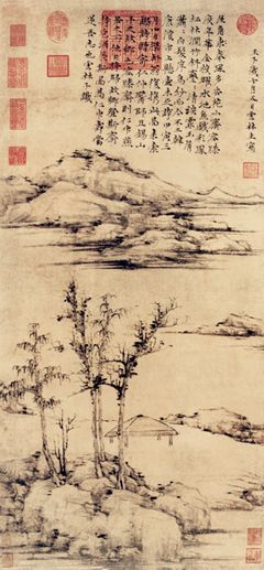 倪云林《容膝斋图》,画的构图是他“一河两岸式”的方式,画面起手处几块顽石,旁有老木枯槎数株,中部为一湾河水,对岸以粗笔勾出淡淡的山影,这里的一切似乎都静止了,水也不流,云也不动,风也不兴,路上绝了行人,水中没有渔舟,寂静的小亭对着沉默的远山,凝滞的秋水环绕着幽眇的古木。是一幅“寒山瘦水”。