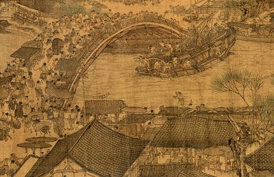 画卷的叙述在清明时节汴河两岸展开。此时冰雪融化,告别了料峭的春寒,迎来了春天最重要的节日——清明节。清明节是中国人二十四节气之一,是思念的节日。这一天,人们要祭祀祖先,这种风俗至今还存在。清明又是庆祝春天到来的佳辰,此时阳光妩媚,春风荡漾,绿草如茵。这幅图的开始描绘的就是汴梁郊外的春色,我们可以看到,野地里溪水潺潺,又有屋舍隐现于丛林之中,道路纵横,历历分明。有老树当风而立,染上了初春的淡淡绿意。向远看去,是绵绵无尽的原野,上有薄雾轻笼,正是柳永词写的“艳阳天气,烟细风暖,芳郊澄朗闲凝伫”。林中忽而露出一队人马,几个仆夫引领着驴队,悠然地向城中赶路。向左去,道路上有绵延的人流,有的是到郊外祭扫的香客,有的是由城中归来的游人,骡马嘶鸣,人声鼎沸。这是远景。