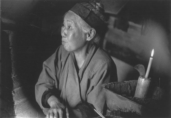 这座孤独的祠堂小得仅能容纳一张供桌和三把椅子。其中一把椅子上坐着一位老道姑。她说,她每天从早到晚坐在这里,为道观看守这座祠堂,由此可以得到面粉和其他的生活必需品。她姓张,是河南省南阳地区的人。当我们的眼睛适应了祠堂里的光线以后,我发现,她缠过足。缠足使得她从儿童时代起,走起路来就颤颤巍巍的了。她说,她每年只在特殊情况下,才下山一两次。她七十九岁了,出家也已五十多年了。近二十年来,她一直过着隐居生活。开始是在西面的太白山上,最近则是在这座能够俯视楼观台的山上。她说,为了修习禅定,她宁愿一个人生活。但是她说冬天很冷,下雨的时候,祠堂的屋顶就漏水。沿着小路再往上走一百米,有一间小土坯房子,茅草苫的屋顶,那就是她的家。那是几十年前另一位隐修者盖的。