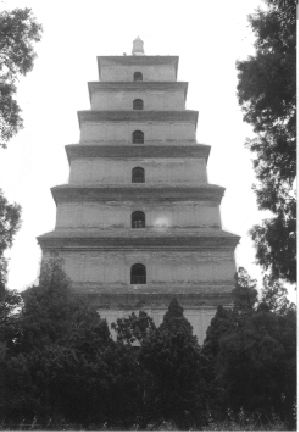 7世纪初,玄奘违抗君命前往印度。25年后,当他返回故土时,皇帝亲自出城迎接。玄奘选择的路线与我们计划的路线基本一致,不过我们可不希望走那么长时间,更不希望遇上那么多的妖魔鬼怪和大劫小难。于是,我们前去大雁塔前烧香祭拜。此塔是玄奘为存放他带回的佛经而建,至今仍矗立在西安城的东南角。事实上,自从公元652年建成后,它一直就是西安城的标志性建筑。在把燃烧的香束插在香炉中之后,我们踏上了通往佛塔各层的台阶。不一会,我们就爬到了第7层,也是最高的一层。塔的四面都有通向外面的拱门,我们透过西面的拱门,从塔顶眺望,脚下便是丝绸之路的起点。