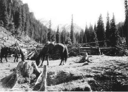 吃过早饭,主人为我们两人备好了两匹小马,也为向导备了一匹,于是我们三人沿着湖边的小路下山。走了大约一公里,很不凑巧,乌鲁木齐市的市长也是今天来游天池,公路被封锁了。但我们是骑马来的,不受影响。三匹马很快爬过了一个山脊,我们已经超过市长和他的随从们来到一大片长满冷杉和牧草的原野,偶尔可见成片的蒲公英,还有一两只易拉罐零星躺在地上。