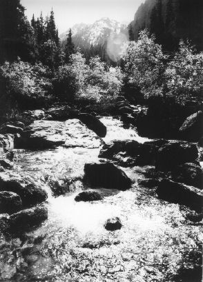90分钟后,我们来到湖的尽头;又过了一个小时,我们抵达“停马场”,骑马的人都在此处下马,然后牵马步行进入山里,我们也是依此照办。走了两个小时后,山道分岔,其中一条通往天山山脉东段最高峰——博格达峰,站在此地便可以望见远处5400米高的峰顶。博格达峰对我们来说太远了,但是坐在从山中滚滚而来的溪流边上,我们已经感到心满意足了,从高天之上奔腾而下的溪水确实让天池名副其实。