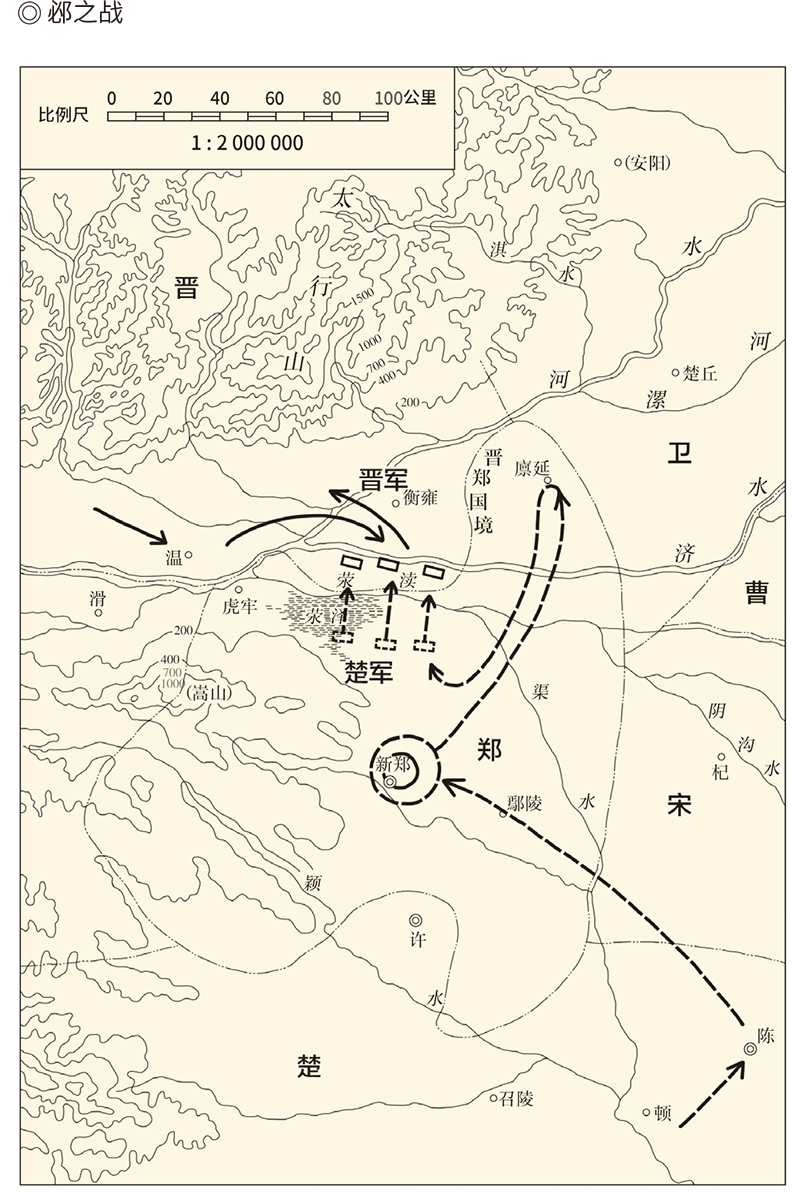 据《中国历代战争史地图集》。公元前597年,大败于城濮之战的楚军,在邲地与晋军再次大战。晋军将佐不和、指挥无力,最终楚军大胜,楚庄王也因此役奠定霸主地位。