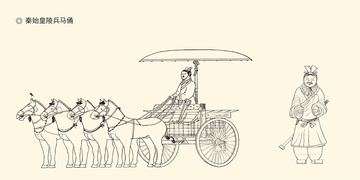 左图为秦始皇陵铜车马,1:1复原实物,技艺精湛。右图为御者俑,表现操作铜车马的兵吏。规模宏大的兵马俑是大秦帝国的一大遗产,也是秦始皇理想的一种表征。