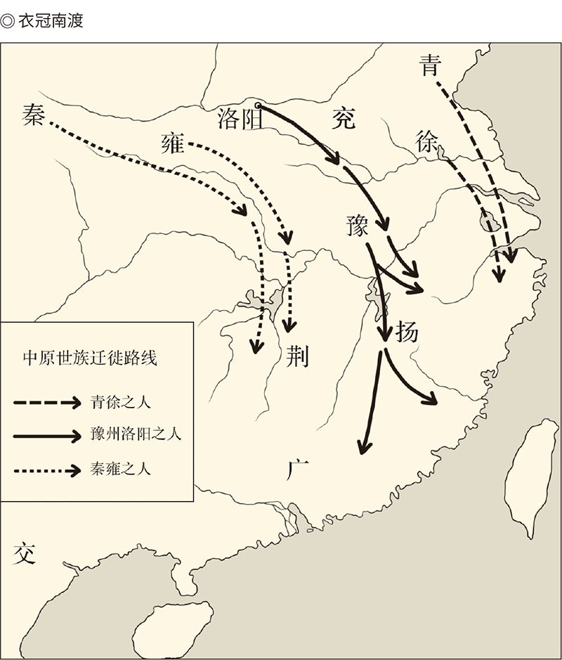 永嘉之乱后,中原世族南迁主要有两条路线——迁往长江下游与长江上游。青徐之地的上层阶级,多迁往首都建邺附近,而殖产兴利,则在会稽、临海之间的区域。次等氏族为避开江左名宗,则迁往京口、晋陵(今江苏)一带。南阳、新野地区(今河南)的次等氏族及雍秦流民,则迁居襄阳(今湖北),形成一个由中层社会阶级组成的强大的武力集团。
