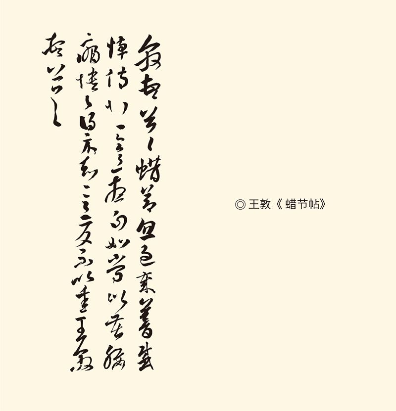 “敦顿首顿首,蜡节忽过,岁暮感悼,伤悲邑邑。想正如常。比苦腰痛,愦愦。得示知意,反不以悉。王敦顿首顿首。”王敦擅书法,但墨迹只有《蜡节帖》传世。王敦写草书,运笔流利,间有纵引,是“今草”的笔调;但结体平正,不如堂侄王羲之草书那样欹侧多姿。