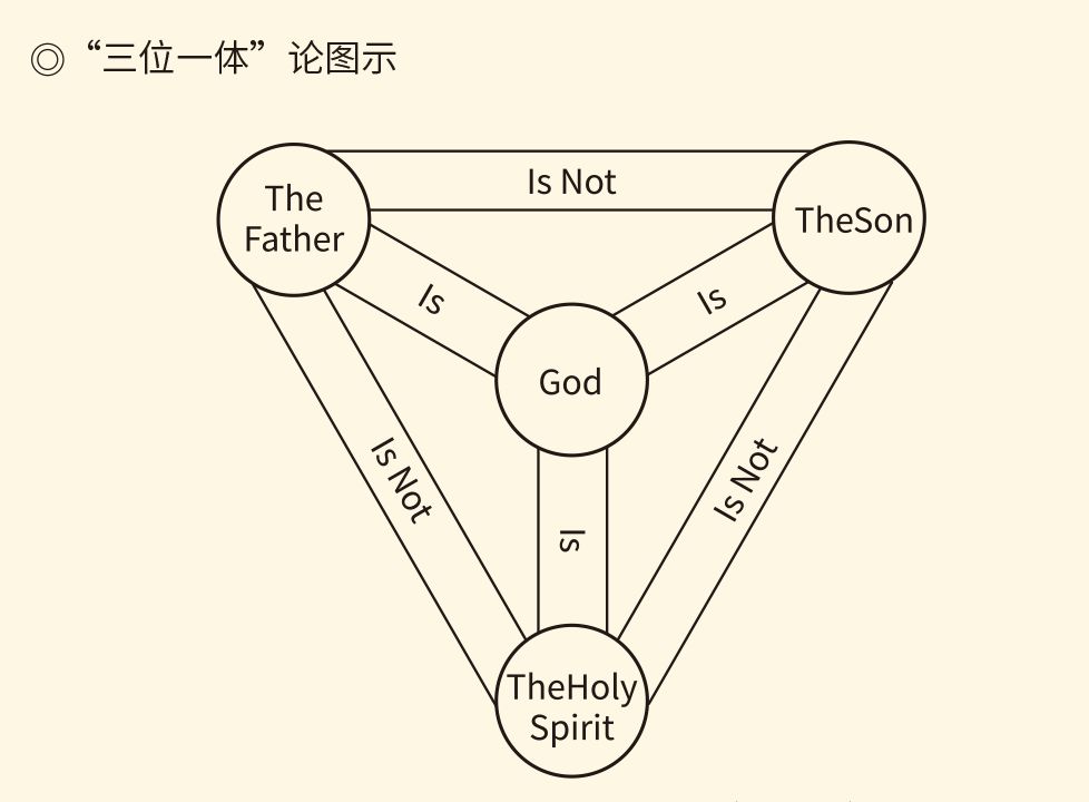 教会给出了解释,而且这解释正是德尔图良在公元3世纪提出的,叫“三位一体”(Trinity)。这种学说认为,作为无须证明的宇宙本体,上帝只有一个,却又包含着三个同等的位格(Person),即智慧生命的存在显现。第一个位格是造物主,即圣父;第二个是道成肉身的救世主,即圣子;第三个是永远存在于基督徒心灵中的指导思想,即圣灵。