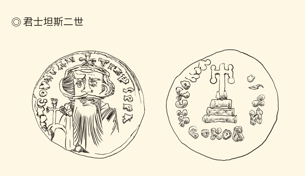 拜占庭索利多金币,直径20毫米,厚1毫米,重4.37克。正面为君士坦斯二世像。这位流放了教皇的拜占庭皇帝,数年后又下令处死同胞兄弟狄奥多西,就此众叛亲离。君士坦斯被暗杀后,他的儿子君士坦丁四世即位。