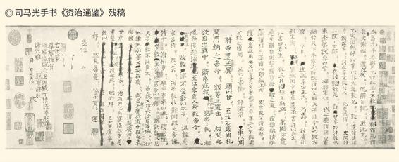 该残卷是司马光唯一传世的《资治通鉴》手稿,为一份提纲,上面有司马光修改的痕迹。纵33.8厘米,横130厘米。中国国家图书馆藏。