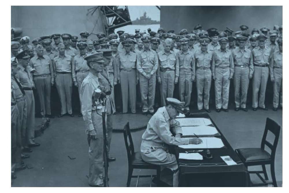 在1945年9月2日,东京湾“密苏里”舰上的日本签字投降仪式后,当时主持仪式的麦克阿瑟,特意安排了一个环节:400架B–29轰炸机在1500架美国海军舰载机的护航下,集体掠过“密苏里”舰上空。