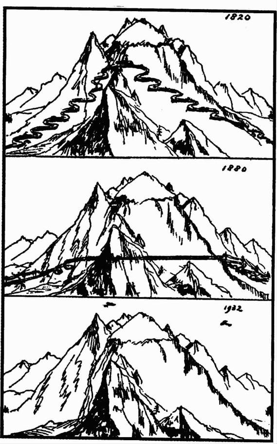 让我们再来看看这里的铁路运输。当然,这项工作困难重重。两条纵贯瑞士阿尔卑斯山的大干线将意大利与北欧连接起来。塞尼斯山隧道连接着巴黎、第戎、里昂与都灵(萨瓦公国的古都)。布伦纳铁路线则在德国南部与维也纳之间提供了一条直接的交通线,而且这条跨越阿尔卑斯山的铁路线没有开凿任何隧道。然而,辛普朗铁路线与圣哥达线不仅要穿隧道,还要爬山。圣哥达线是这两条铁路线中较早的一条,1872年就开始修建,10年之后才建成通车,其中用了8年的时间去开挖那条长达9.5英里、海拔高度达4000英尺的隧道。比这条隧道更值得一提的是从瓦森到格舍切的螺旋隧道。由于那里的山谷太狭窄,甚至于无法铺设单轨,所以铁路线不得不从大山中间穿越过去。除了这些特殊的隧道外,这条铁路线上还有59条其他的隧道(其中几条长达1英里)、9座高架桥以及48座普通桥梁。