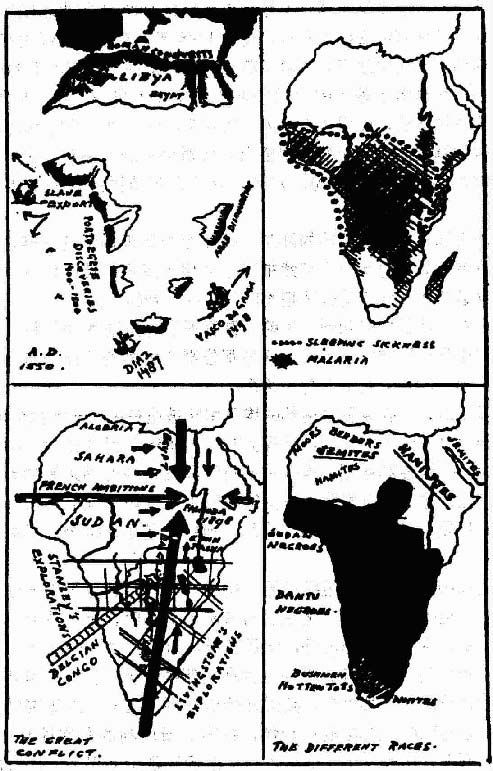 当埃明帕夏的命运成了世界普遍关注的话题时,寻找他的最佳人选就自然而然地落到了斯坦利的头上。他从1887年开始察访,第二年,他在紧靠阿尔伯特湖北边的瓦德拉找到了埃明。埃明好像正在用一种可怕的力量对付当地的土著居民。斯坦利试图说服埃明为比利时国王效力,这可能意味着非洲大湖地区也会被并入刚果殖民地的版图,但埃明似乎已另有自己的打算。他一到桑给巴尔(其实他并不急于被“救”出来),就与德国当局联系,最终德国当局决定送他回去,并给他提供充足的人力和资金,以便让他在维多利亚、阿尔伯特和坦噶尼喀三个大湖之间的高原上建立德国的保护地。早在1885年,德属东非公司便在桑给巴尔海岸地区获得巨额利润。如果再加上那一片大湖地区,德国就能让英国的计划成为泡影。英国的计划是,建立一块从埃及到好望角的英国海外领地,从而把非洲分成两半,可是1892年,埃明在刚果河上的斯坦利瀑布附近被阿拉伯奴隶贩子暗杀。这个严厉的德国人年轻时曾理所当然地吊死了那帮人的同行们,遂遭到他们的报复。埃明在坦噶尼喀湖高原上建立新德国的梦想因此随风而去了。然而,当年为寻找他的下落而进行的探险,却使中非的大部分地区被我们探明,并得以标注在现今的地图上,这就把我们引入非洲的第五个自然部分——东部的高山地区。