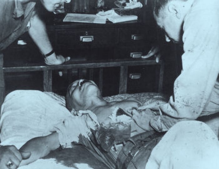 宪兵和记者迅速冲入房间,他们看到东条英机坐在客厅沙发上,左手握着一把手枪,胸口血流如注。