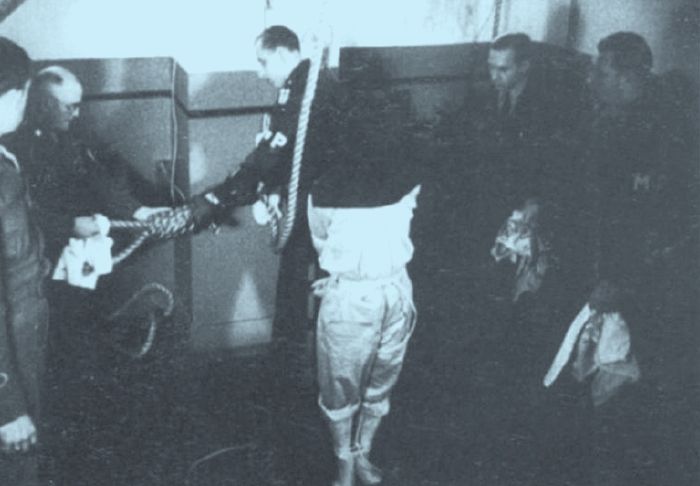 随后,在美国宪兵军官的命令下,东条英机和其他3名第一批战犯一步一顿地跨上了绞刑台的十三级“死亡台阶”。上了台阶,他被喝令向监刑官站定,头部立即被罩上了黑色布套,接着,绞索套在了他的颈项上。