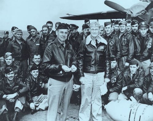在起飞前,杜立特和他的敢死队队员们一起在“大黄蜂号”甲板上,留下了这张合影