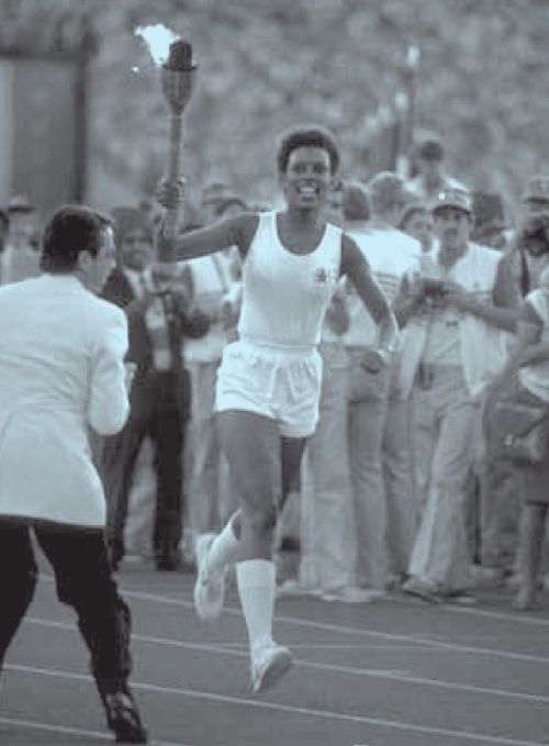 在洛杉矶奥运会的开幕式上,杰西·欧文斯的外孙女吉娜·亨普希尔持火炬跑进主会场