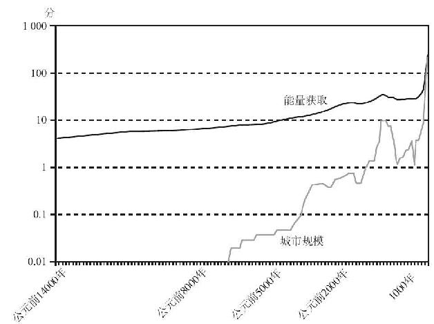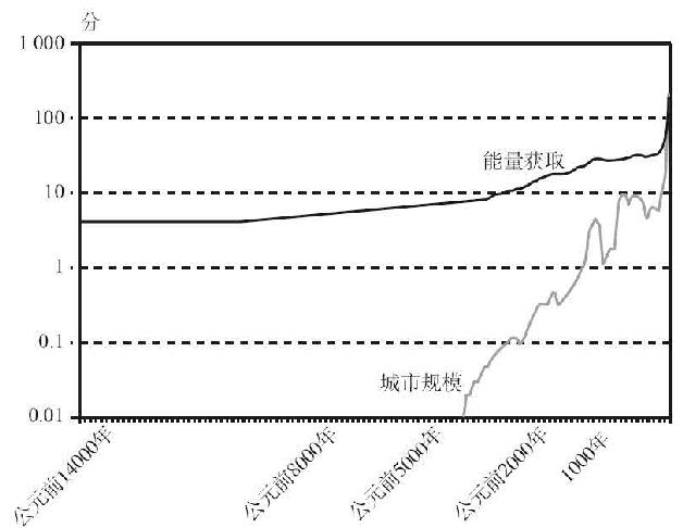 图4.2 公元前14000~公元2000年西方能量获取情况与城市规模在对数–线性标尺上的对比(以社会发展分数衡量)