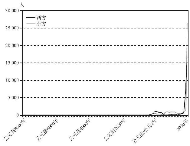 图4.1 公元前8000~公元2000年东方和西方最大的城市的规模