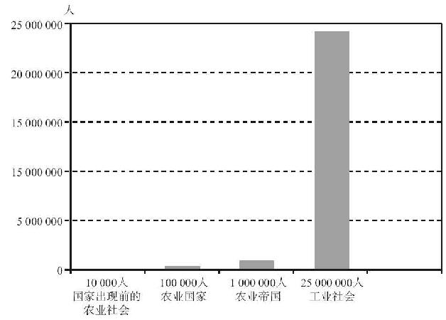 前现代时期有序的层层递进,当然部分是因为定量估计的粗糙性(图4.7中线顶点是平的纯粹表明我们资料的缺乏;罗马、长安、开封和杭州拥有80万或120万人口,与图中标绘的它们拥有100万人口,是同样有可能的)。然而,结果的一致性的确表明了一个值得以世界上其他地方的数据进行检验的假设——如果没有化石燃料带来的能量激增,以及与之相关的组织和技术方面的收益,则没有人能生活在人口超过100万的城市中。我们还需要观察,我们目前的发展水平会给城市规模设置怎样的上限,以及我们是否能突破这个上限。