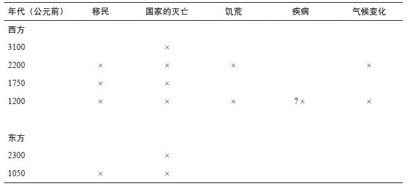 第二组——西方在公元前2200~前2000年的危机和东方在公元前1200~前1000年的危机——却迥然不同,很明显是因为自然因素使人类看上去更愚蠢。人类基本上无法控制气候的变化,气候变化至少是造成这段时期饥荒的原因之一(如果圣经中约瑟的故事能给我们一些启发,那就是缺乏农耕计划也是造成饥荒的原因之一)。第二组社会危机比第一组严重得多,我们可以从中得出一个试验性结论:当天启四骑士——气候变化、饥荒、国家灭亡和移民——走到一起,特别是当第五位骑士疾病加入他们的时候,社会动乱会变成社会瓦解,有时甚至会导致社会发展的倒退。