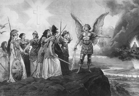 图10-5 “黄色的危险”:这幅画是根据德国威廉二世创作的草图而绘制的。威廉二世解释说,此图的创作意图在于鼓励欧洲人联合抵制佛教教义、异教教义和野蛮的侵袭,保卫基督教