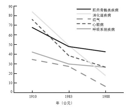 图10-7显示的是美国退伍军人受哪些慢性疾病的困扰,从图中我们可以得知人们的健康状况提高了多少。考虑到其工作具有暴力性,退伍军人可能不是研究人类健康的理想样本。但是由于军队保留了大量记录,因而退伍军人这个集合成为研究的最佳子集,从中可以发现退伍军人的健康状况得到了惊人的改善。