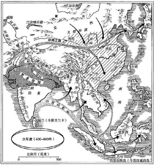 在印度向东南亚扩张的最初阶段,尽管佛教曾经发挥了作用,但是在该地区最流行的是印度教的宗教思想和仪式,也许因为印度教比佛教对当地的宗教传统更加宽容。印度教从未对喜马拉雅山以北地区产生重大影响。相反,佛教像滚滚洪流,涌入中国,然后从中国于公元200~600年传播到朝鲜和日本。