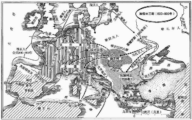 因此,正是文化和政治上分裂的基督教世界面临着第三轮也是最后一轮蛮族入侵。从南俄逃亡出来的一支新的战争力量再次穿越匈牙利平原,并从这个基地出发,四处劫掠。这轮入侵者被称为“马扎尔人”或“匈牙利人”。896年他们越过喀尔巴阡山山口。不久,北非的穆斯林国家几乎摧毁了拜占庭的海军力量,打破了地中海地区的均势。一系列大规模海盗袭击接踵而至,矛头直指地中海北部沿岸各地。与此同时,维京海盗发动了同样甚至更残酷的侵袭,他们的基地在斯堪的纳维亚。