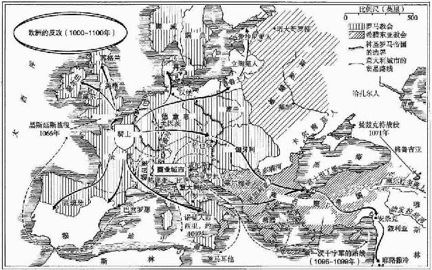两种其他重要变化增加了新兴欧洲社会中世纪制度的范围和力量。一是重犁的传播,这在前文已经提到(第201页)。以这种犁为基础的农业为维持足够的骑士、使欧洲变得真正强大提供了必要的经济基础。第二个是欧洲北部海域贸易的发展。海盗和海上打劫者很快便发现,当抢劫不再易行时,贸易可能是有利的。四处流动的商人、水手、业余海盗常常发现,在一个比较永久的基地定居下来是比较方便的,只要那里的交通路线和安全的港口能够带来适当的场所。中心就以这种方式形成了,后来中世纪欧洲城市生活就兴起于欧洲北部的这些中心。对未来西方文明发展最重要的是,第一批欧洲城市居民习惯于自己管理自己的事务,反对任何外来干预者。这赋予西北欧市民阶层显然不同于其他文明的市民所习惯的、更自信的生活方式,而其他文明盛行保护社会优越者和礼貌地迎合地主和官员。
