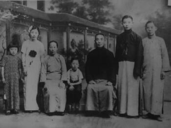 1940年前后的全家福(左起:三姐关淑芬、大嫂关桂兰、母亲章润洁、四哥关嘉祥、父亲关鹤鸣、大哥关嘉培、二哥关嘉勉。时关嘉禄尚未出生)(关嘉禄提供)