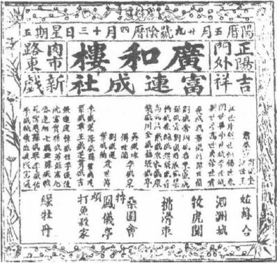 那时没戏报,今儿唱什么戏什么戏,在门口有牌子,叫水牌。后来才专有刷戏报子的,今儿什么人唱什么人唱,都写好了,上午十点左右就刷齐了。独广和楼没有,到时候临时定,也是习惯嘛。