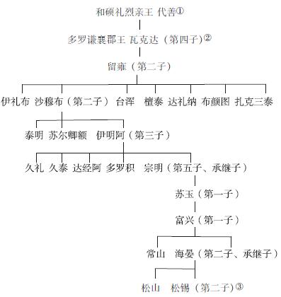 秉钧先生人很聪明,记忆力惊人。他会唱不少曲子,访谈基本上是在他的边说边唱中进行下去的,这很有趣。至于他讲的宫廷逸事有多少是真,又有多少是杜撰,与其认真地一一核实,倒不如将其当作爱新觉罗家族中一些人的特定趣味来看,更有意义一些。何况对这些逸事津津乐道的,不仅仅是爱新觉罗后裔,也有寻常百姓,乃至成为当今社会上的普遍风气。《爱新觉罗宗谱》中何秉钧家族支脉一览: