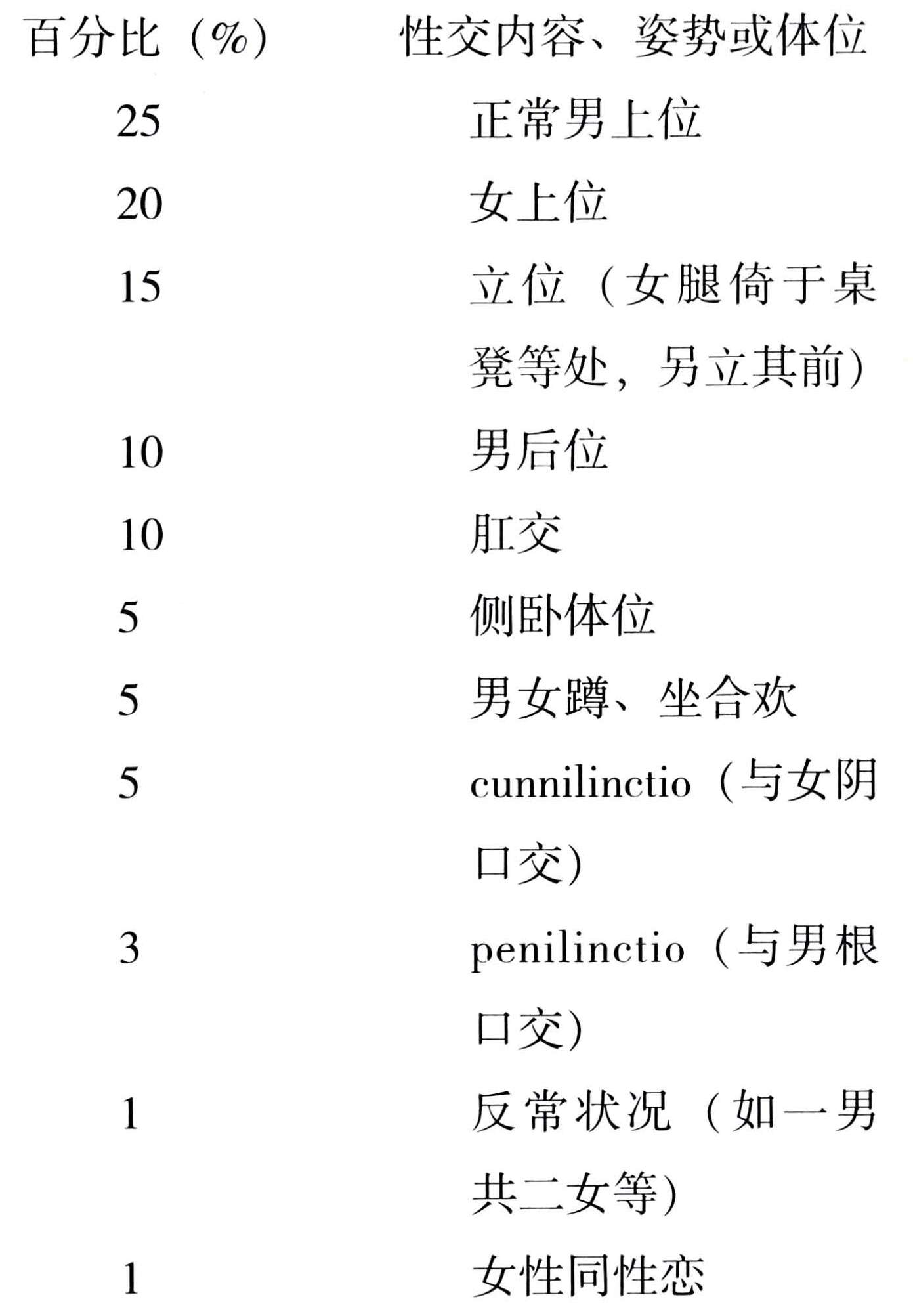 高氏曾寓目中国春宫画册十二种,共三百余幅,他统计了其中所描绘的性行为姿势,得到如下结果:(25)
