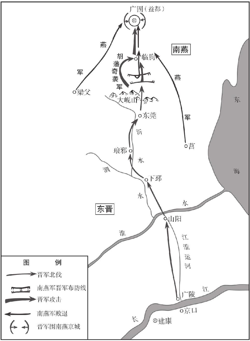 晋军在下邳弃舟登陆,徒步沿沂水向北进军。从下邳到琅琊(今山东临沂)之间,是鲁南、苏北的平原地带;再向北是沂蒙山区(时称大岘山),翻越山区之后,就是燕都广固所在的鲁北平原。刘裕这个反常方案,是综合考虑晋军后勤特点、战区地形及两军兵种差异等因素之后的大胆创新: