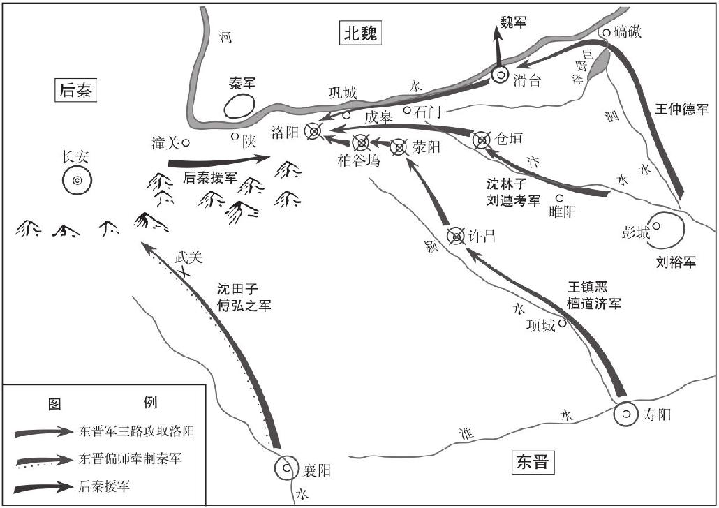 义熙十二年(416年)正月,秦帝姚兴去世,姚泓继位。此时后秦外有赫连勃勃武装的骚扰,内有宗室成员的不满和觊觎,统治很不稳定。但北魏和后秦皇室有联姻之好,所以北魏坚决支持姚泓政权。姚兴死去的消息传到东晋,刘裕迅速做出伐秦决定。二到三月间,他操纵晋安帝朝廷给自己加“中外大都督”之号,东晋举国戒严,进行全面军事动员。[12]四月,刘裕正式发布文告,声称“今当奉辞西旆,有事关河”[13],宣布伐秦计划,但战事直到秋季八月才正式开始。(关于此次战役,可参考图7)