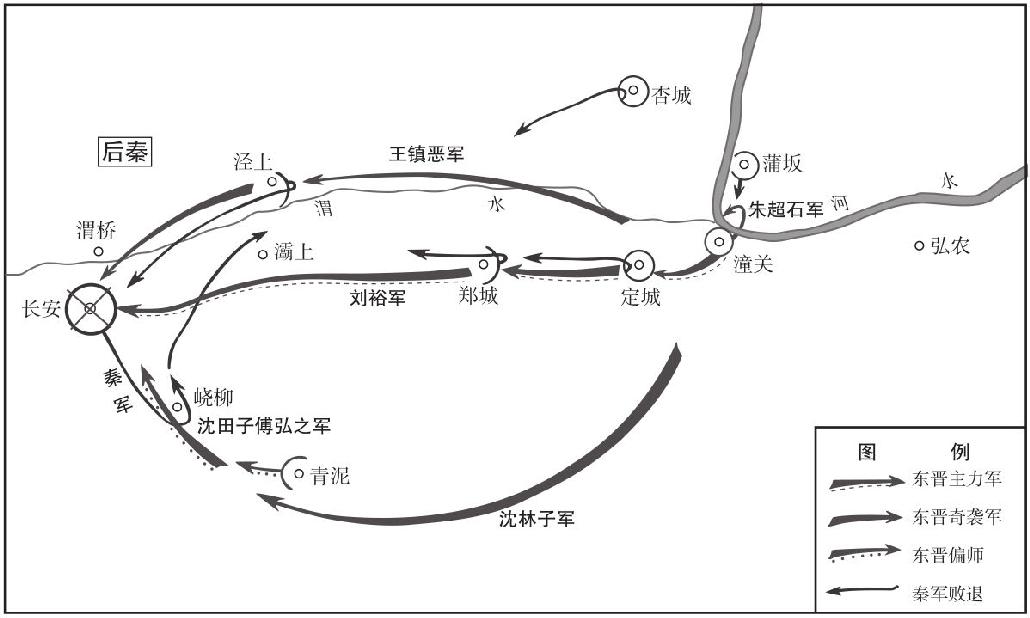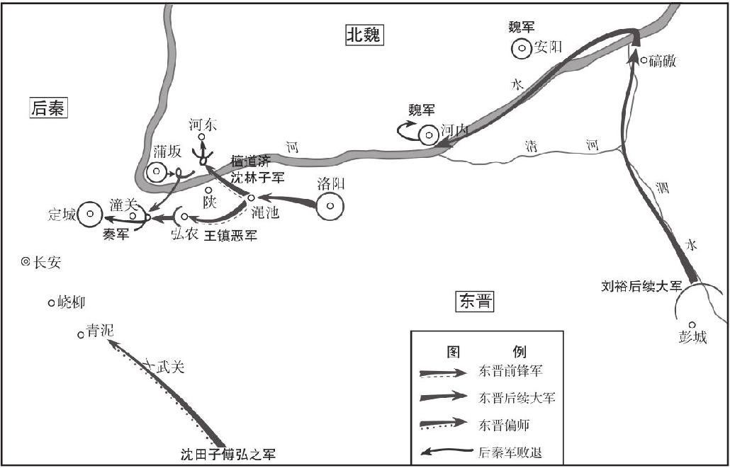 三将擅自西征:义熙十二年底,晋军刚刚进占河南之后,后秦内部发生动荡和内战,到义熙十三年正月,叛乱被扑灭。此时,河南的晋军将领看到后秦受叛乱削弱,不愿坐失时机,遂不顾刘裕部署,主动向西发起攻击。最先擅自西进的是王镇恶。他从洛阳出发,循洛水西上宜阳,从南方迂回占领渑池,然后向潼关进军。檀道济、沈林子看王镇恶投入战斗,不甘灭秦之功被其独占,也率部西进。到达陕县(今三门峡市)后,檀、沈认为秦军重兵在潼关阻击王镇恶,黄河北岸疏于防范,遂北渡黄河试图从蒲坂进入关中。但秦军严密防守潼关、蒲坂,三将与秦军鏖战数月,都无法冲入关中。